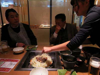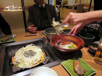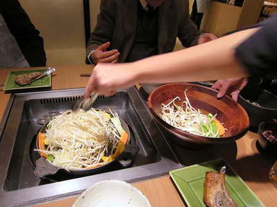 そしておねえさんが焼いてくれます。 まず野菜から入れるのですね。