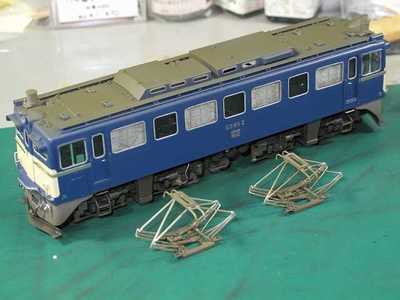 ED60ともどもパンタグラフの擦板の銅メッキを磨き出してから艶を調整したクリヤラッカーを塗りつけて艶や色合いを守ります。