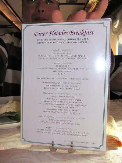 9:02 3号車「ダイナープレヤデス」食堂車にやってきました。 9時からの朝食です。