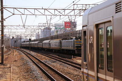 12:44 吹田付近でEF66の貨物列車を追い抜きます。 (停まっているに近いですが)