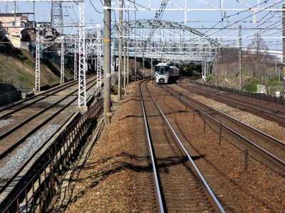 130㎞/hでぶっ飛ばしてきた新快速も山崎駅周辺は制限が有り100㎞/h以下に抑えられます。