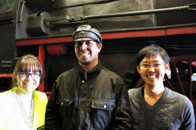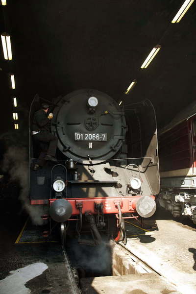 松岡君が機関助手に訪ねると 01 066 は少し先の機関区にいるとのことだった。 先には結構大きな扇形庫があった。 01 066 はすでに庫の中に入って点検、保守作業中だ。 松岡君が話かけるが皆忙しそうだ。 マックス君が機関車の下に入っているのに気づき、さっそく写真を見せている。