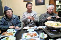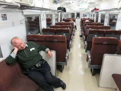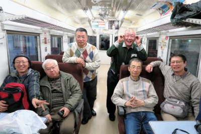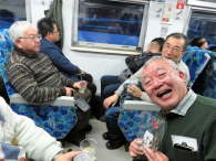 車内宴会は続きます。 私の持った袋に姫ししゃもの文字。 写真;増田秀則さん