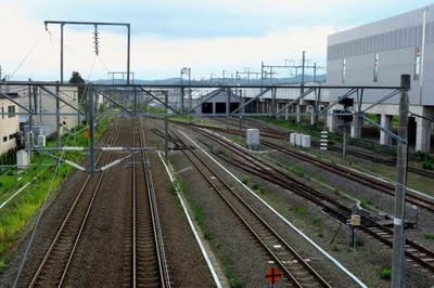 駅の向こう側に見える線路は狭軌線で貨物列車は新幹線駅構内を通らない構造になっています。