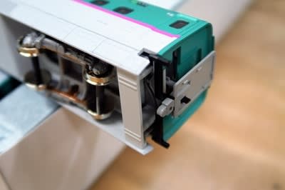 KATOのE5系の場合、妻板押さえモルトを上に寄せて固定するのはこの連結部構造を避けて左右動を押さえる必要があるからです。