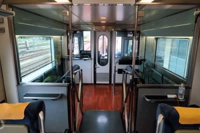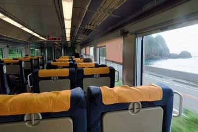 助士席後方のかぶりつき席と日本海眺め用の窓と椅子。