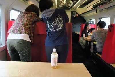 足湯は残念ながら満員ですが、5号車‘湯上がりラウンジ’に遊びに行きます。