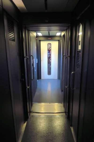 勾配の有無で不思議な眺め、客室はハイデッカー、左はトイレです。