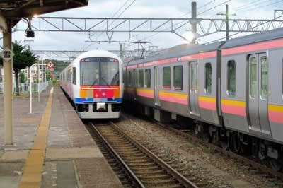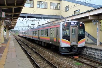 この色合い、先程村上駅で見た電車(E129系)の色だと思います。