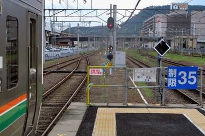 キハ40が発車していきます。 653系【いなほ】が側線に待機、これから入線してきます。