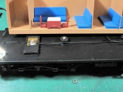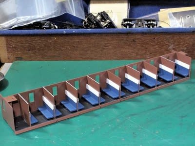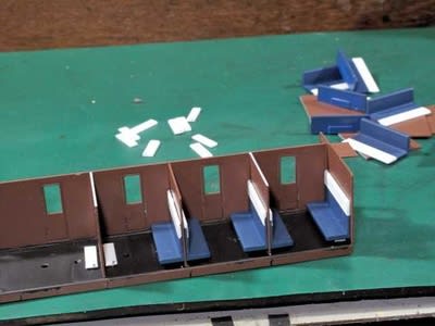 椅子、カツミ&KATOのプラ成型椅子の青・・・悪夢かと思ってしまう安っぽい青に塗られています。