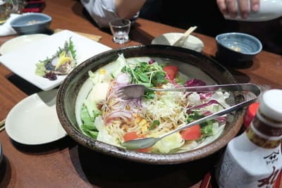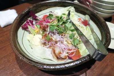 手前にラーメンサラダを置くと小ささが際立ちます。 老眼には有るのか無いのか判らないというレベルです。