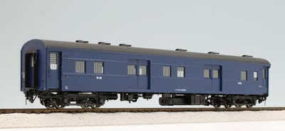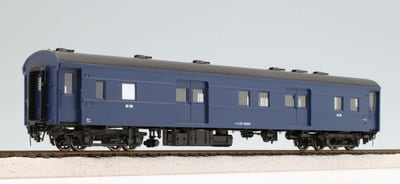 パレット用の荷物車で、その区別の必要上青に塗装されていたのですが、荷物室の大きな扉の下側の高さが低いのだそうです。