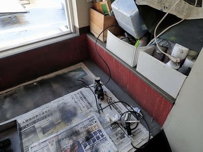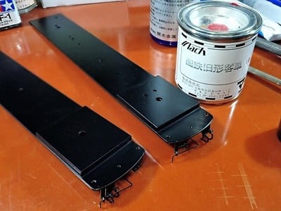 塗装場に持ち込んで黒吹きつけ作業中。