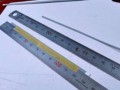 車体前後に枕木方向に有るランボード、しかと資料が無く、いろいろ観察して車体全長に有る250mmでもパンタ脇の150mmでもなく200mmなのではないかと思い決めて250mmランボード(3mm)から切り落として200mmランボード(2.35mm)を作っています。