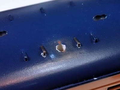ケガキに合わせて穴あけして脚を付けたら左右より内側よりだったので細いヤスリで穴を少し外側に広げます。