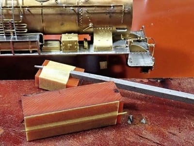 不揃いになるのも格好悪いかなと思ってバローベのヤスリをこんな風にベークライト片に貼り付けて真鍮線の断面を揃えてみました。