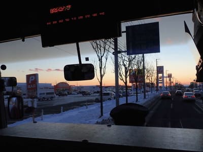 バスの先頭の椅子から落日の跡を。