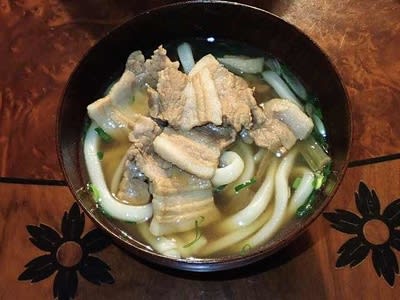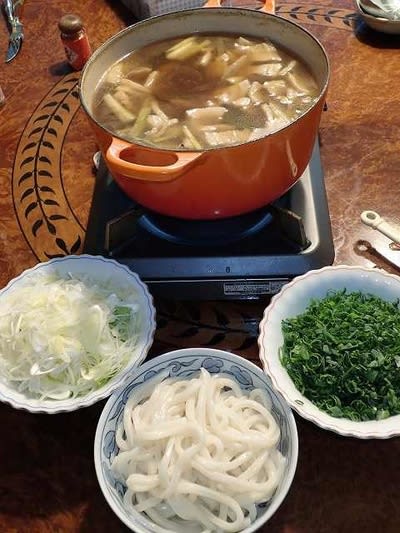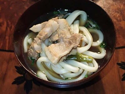 唐神家でうどんをご馳走になりました。 豚肉と長葱が入ったスープでうどんを温めて