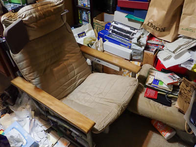 コレは模型室(ビデオ編集室とも言います)の中の椅子です。 コレに座って一日中作業しています。