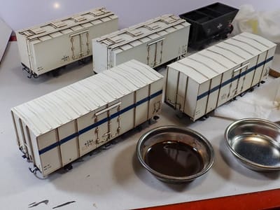 この手の貨車。屋根はどうするのか考えましたが従来の汚し方を見ると此の程度で放置もあります。