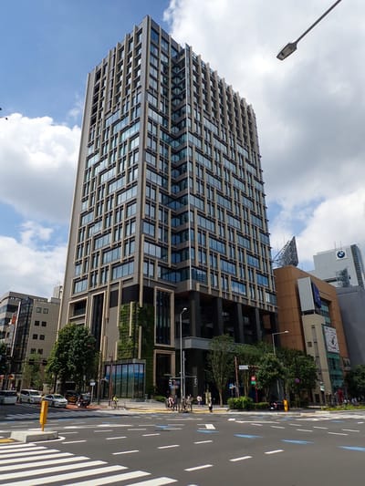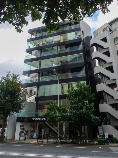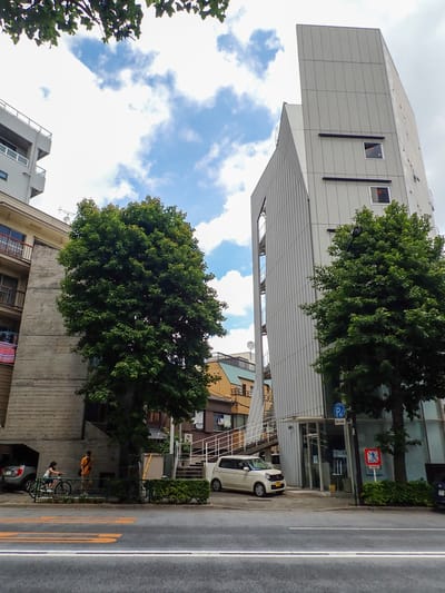 原宿幼稚園前の交差点を左折すると秩父宮ラグビー場からの帰り道になってしまうので外苑西通りを北上します。 非常階段の作りが面白いビルを見つけました。