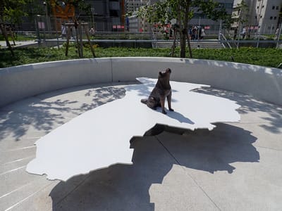 渋谷区形の休憩ベンチと真ん中に鎮座するハチ公。