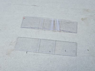キハ58系の平面窓は車体幅一杯に広い為、三つ折れの全く同じサイズのモノを接着しなくてはなりません。