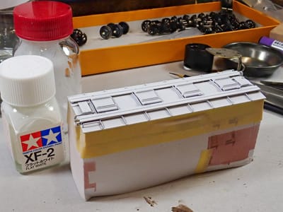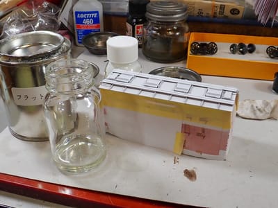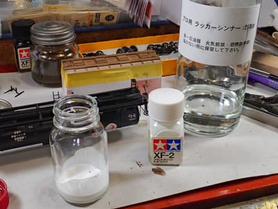 こんな色になったらダメなのでエナメルのフラットホワイトをラッカーシンナーで薄めて塗ります。