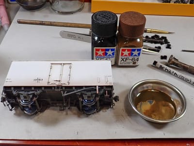 赤は強過ぎて黄色や緑を入れる大事になり、白い貨車が対象の時鉄則にしているクリアラッカーを加えた調色が省略になりました。