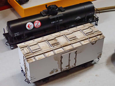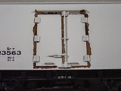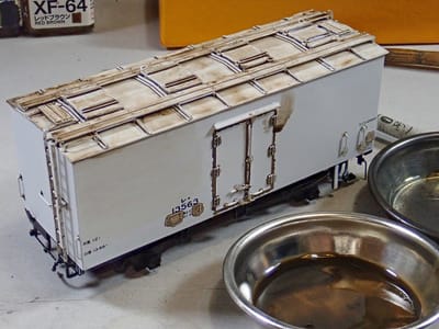 タサ1700の汚し吹付の際、汚しが届き難い台枠内側に薄い汚しを筆で入れます。