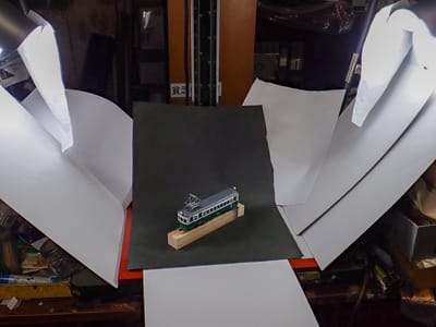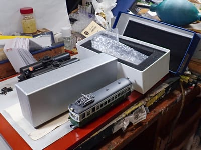せめて収納場所を“アートプロ“の軽便電車の箱(右奥)を横取りすることにします。 何故そうなるのかというと、左手前にある銀色の「狭幅電車用箱」の用意が出来ているからです。