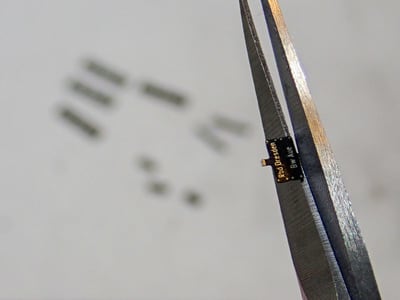 その団子をピンセットで摘み、ナンバープレートは左手の爪で押さえて団子をペタペタしてはみ出したゴム系接着剤を全て絡め取ってしまいます。