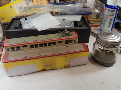 クハ102は完成品(このように最後のレタリングが残っている製品は未完成品ですが)のままで完成していません。