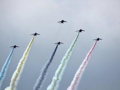 国立競技場ではなく代々木公園方面で五輪マークを描いています。