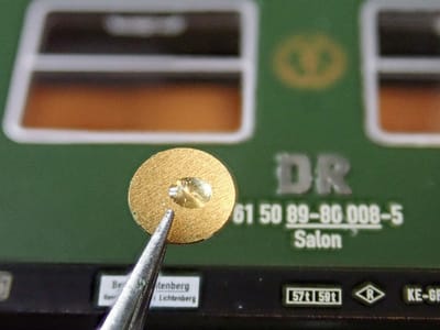 エッチングによる“DR"マークを貼り付けなくてはなりません。 (裏側のゴム系クリア接着剤の様子を見せています)