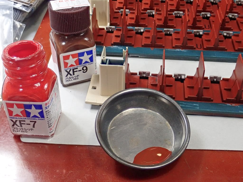 吹き付けられた色は“ダルレッド”艦底色です。 調色して塗ろうとしているのは“ハルレッド”艦底色と“フラットレッド”“艶消し赤”の組合せです。