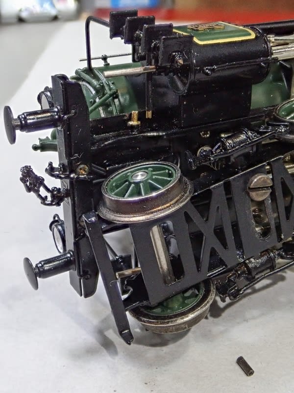煙室から生えた手すりに階段が付いている部分が壊れていました。 細密パイプ10/08を使います。 黒染めしたものが下に見えています。
