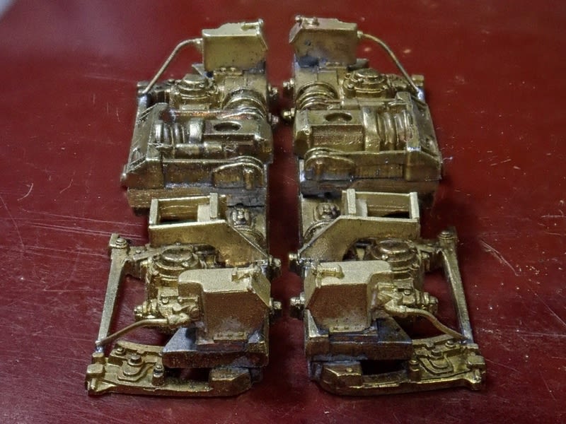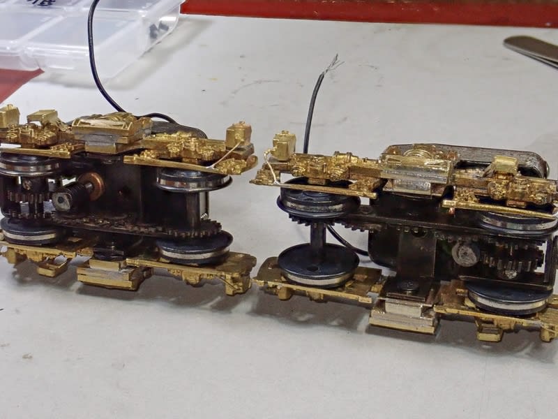 スリムになって組み立てた台車が右側、左はワッシャで誤魔化しながらの仮組立。