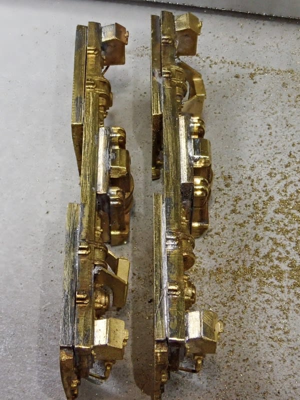 左の仮組立をバラして台車枠削りが始まりました。 太い輪ゴムを利用したヤスリ掛け。