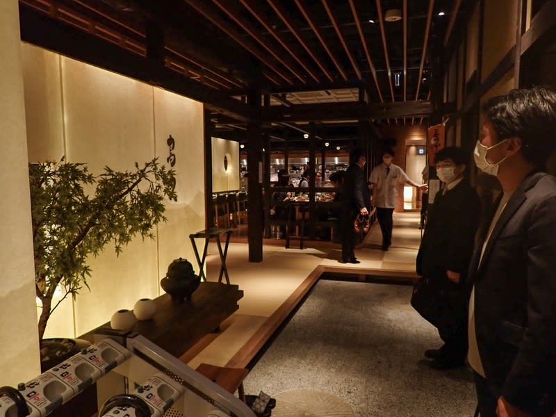 「ハツリ」(削り)工事をテナント営業中にやれるわけもなく、石のようなものを貼って撤去跡を隠しています。