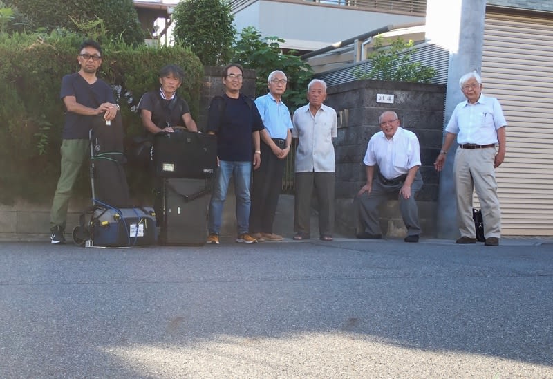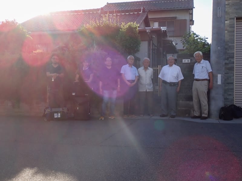 川端さん宅前で7人で記念写真。 あまりの逆光に