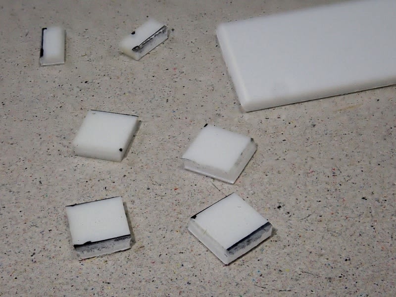 それを正位置にに固定するために4mm角の1mmプラ破片を作ります。 これにリード線エナメル線が通れるようにヤスリで整えます。
