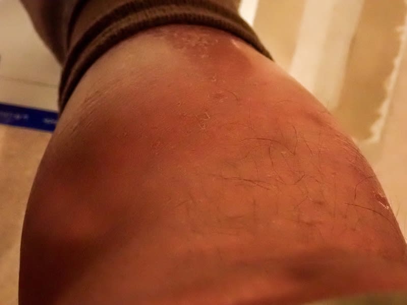 足がパンパンに浮腫んでいます。 指の後がつきます。 写真でわかるかどうかツヤツヤです、 赤いです。