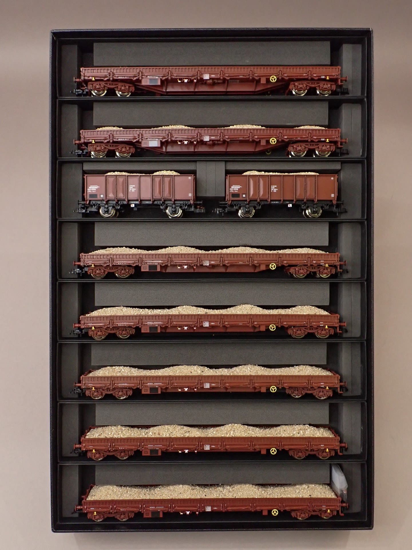 入れてみました。 一番下の砂運車(此処では積荷が砂ですが、木材を積む機能が大事な貨車と感じます)の右に予備パーツが置いてあります。