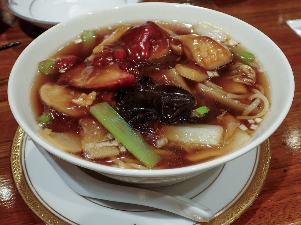 つまらぬものですが、4人前を9つに割った締めの五目そば。
