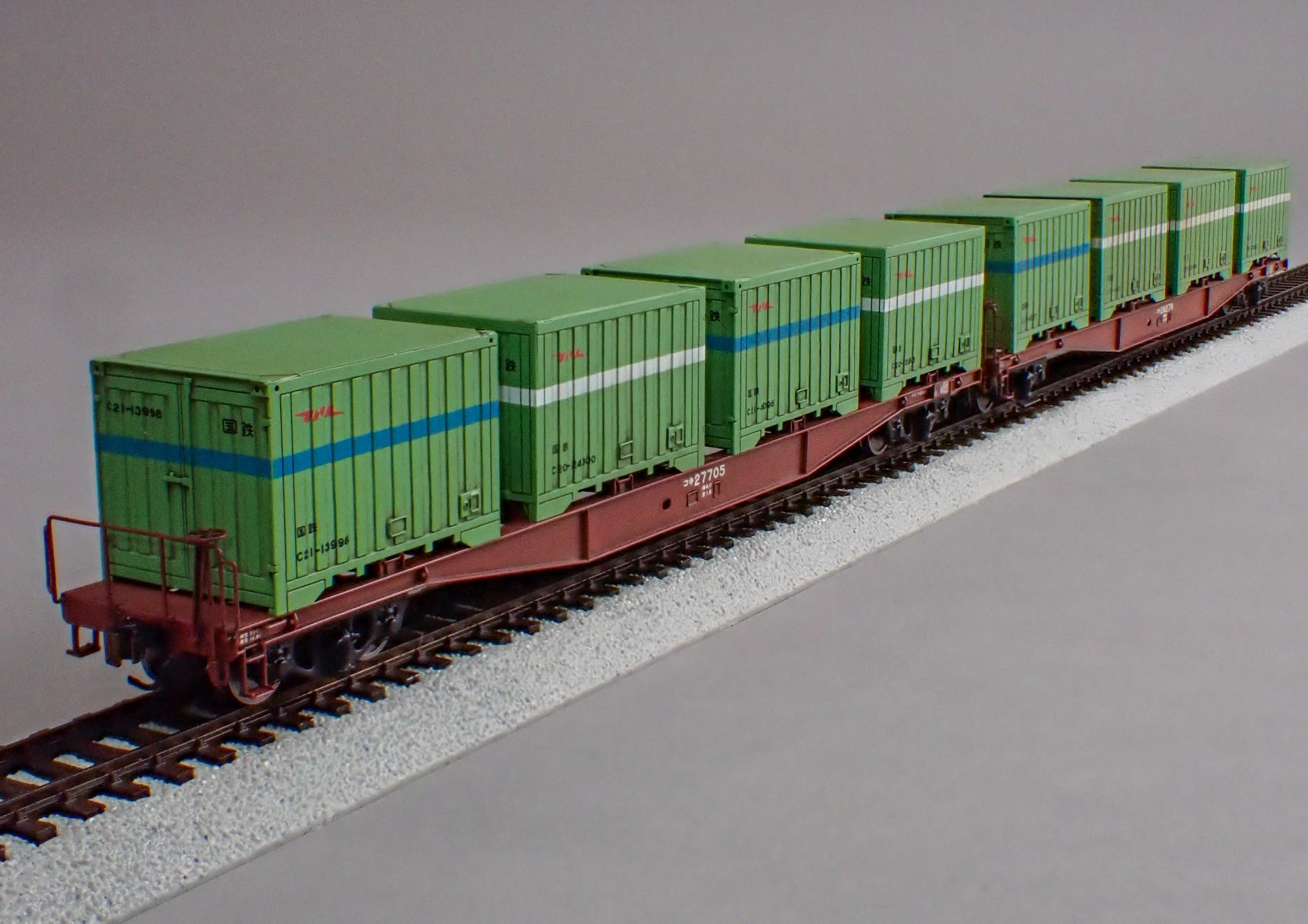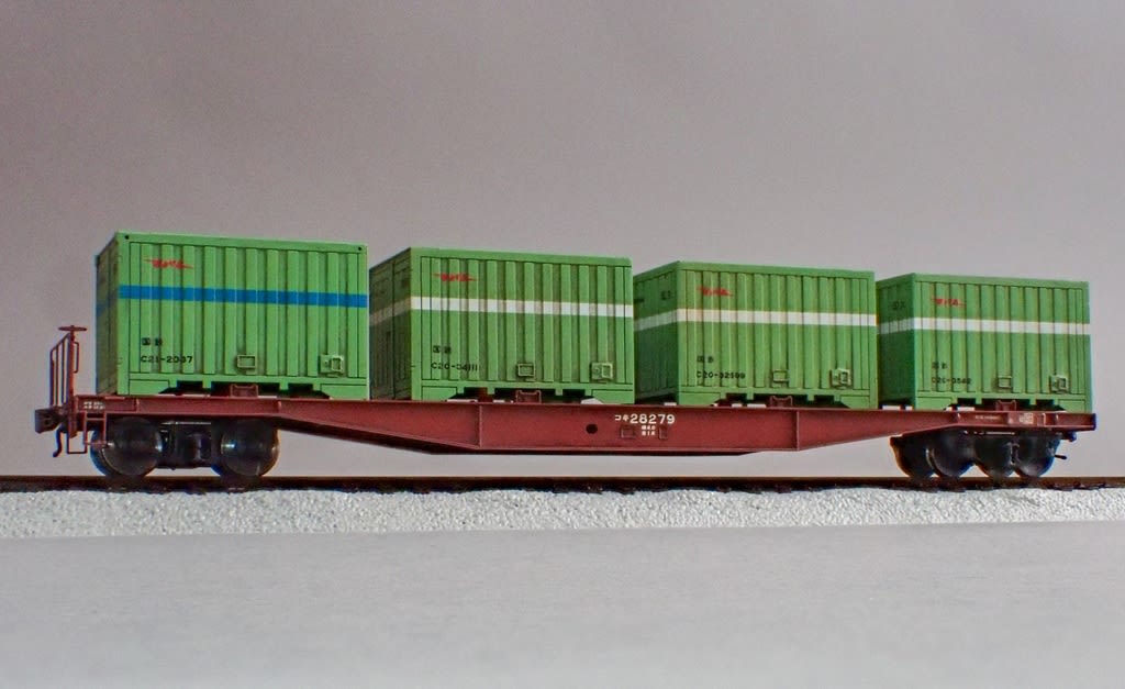 本当は台車を分解してエアブラシでウェザリング、コンテナ頂部もエアブラシで架線汚れが出来れば最高ですが。