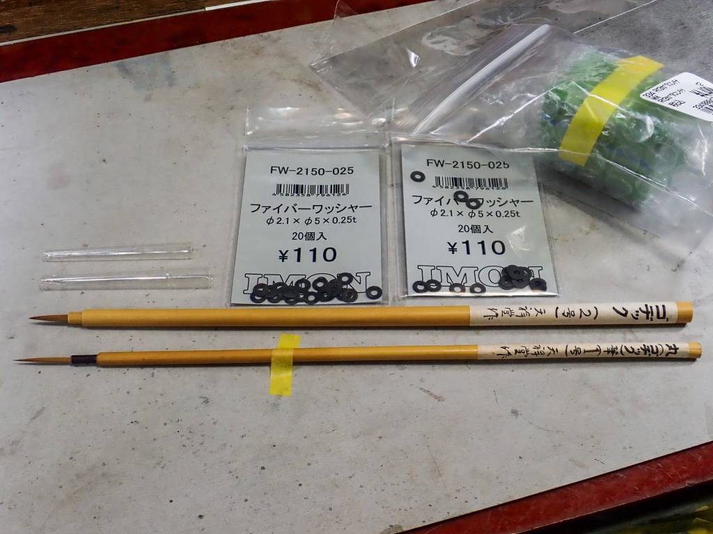 昨日会社から持ち帰ったのは筆が2本と220円で買ったファイバーワッシャ40個です。