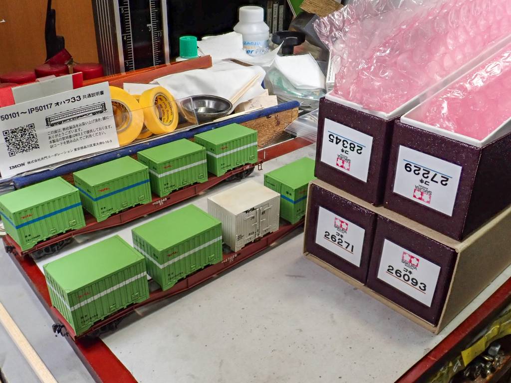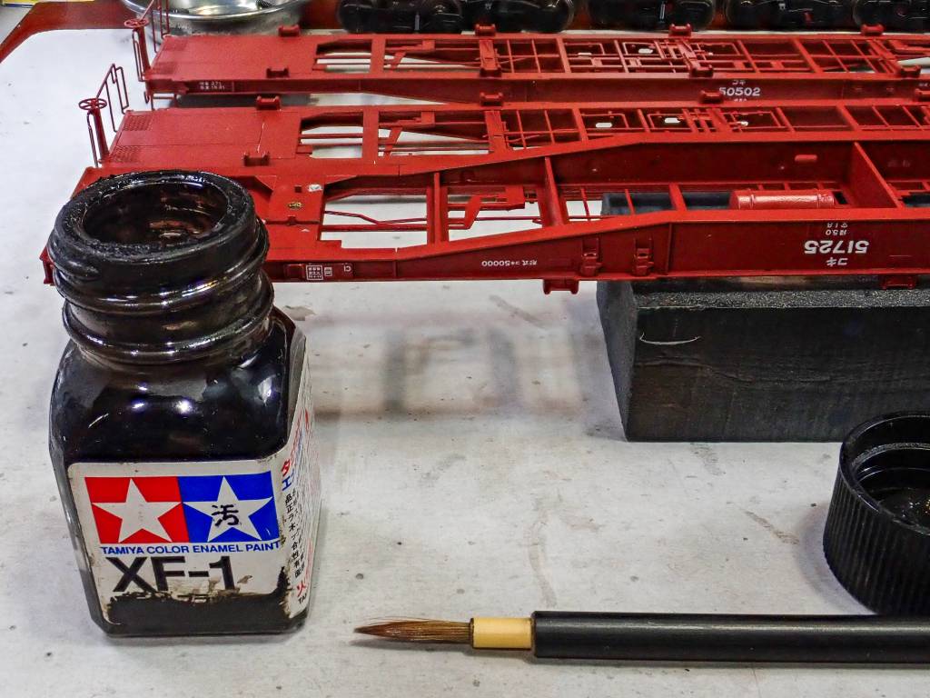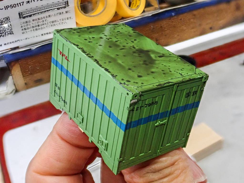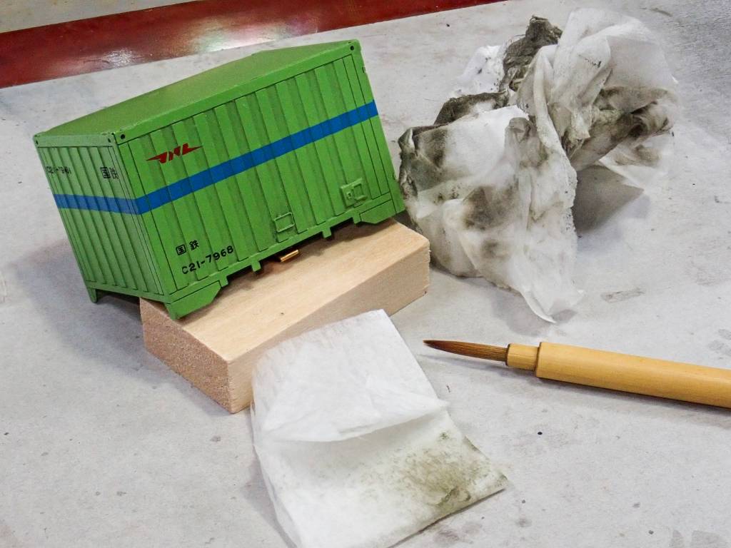 コンテナは明るい汚れ色で墨入れし、コキ本体は暗い汚れ色を使います。