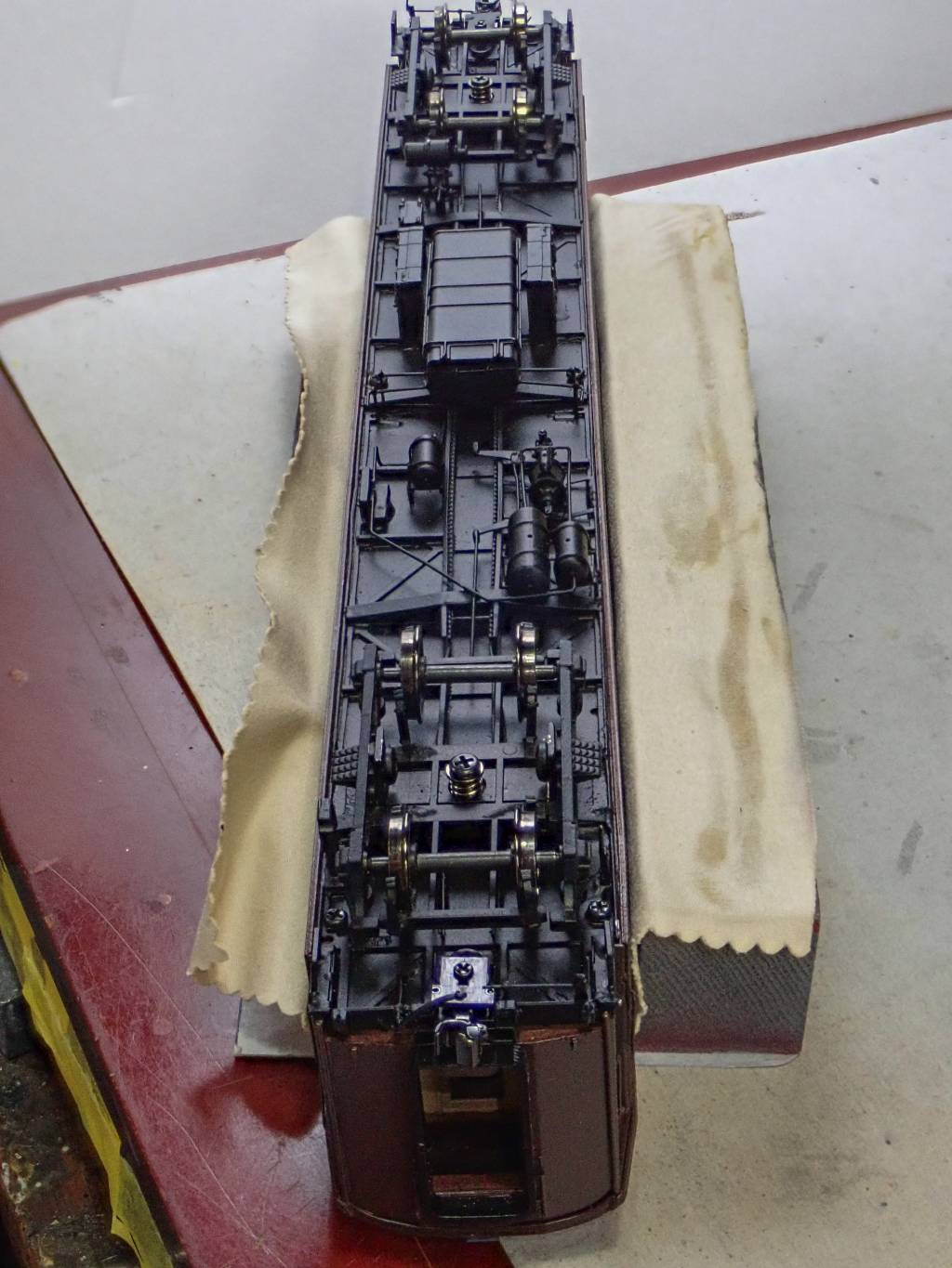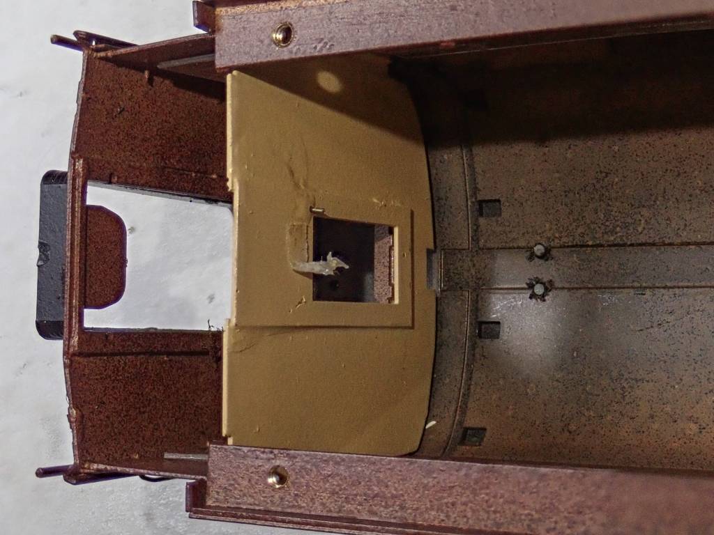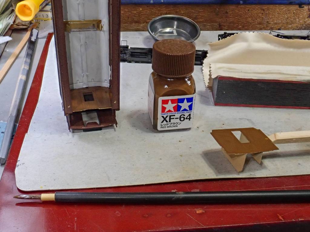 客室から見える部分はニス塗りと見てレッドブラウンに塗ります。